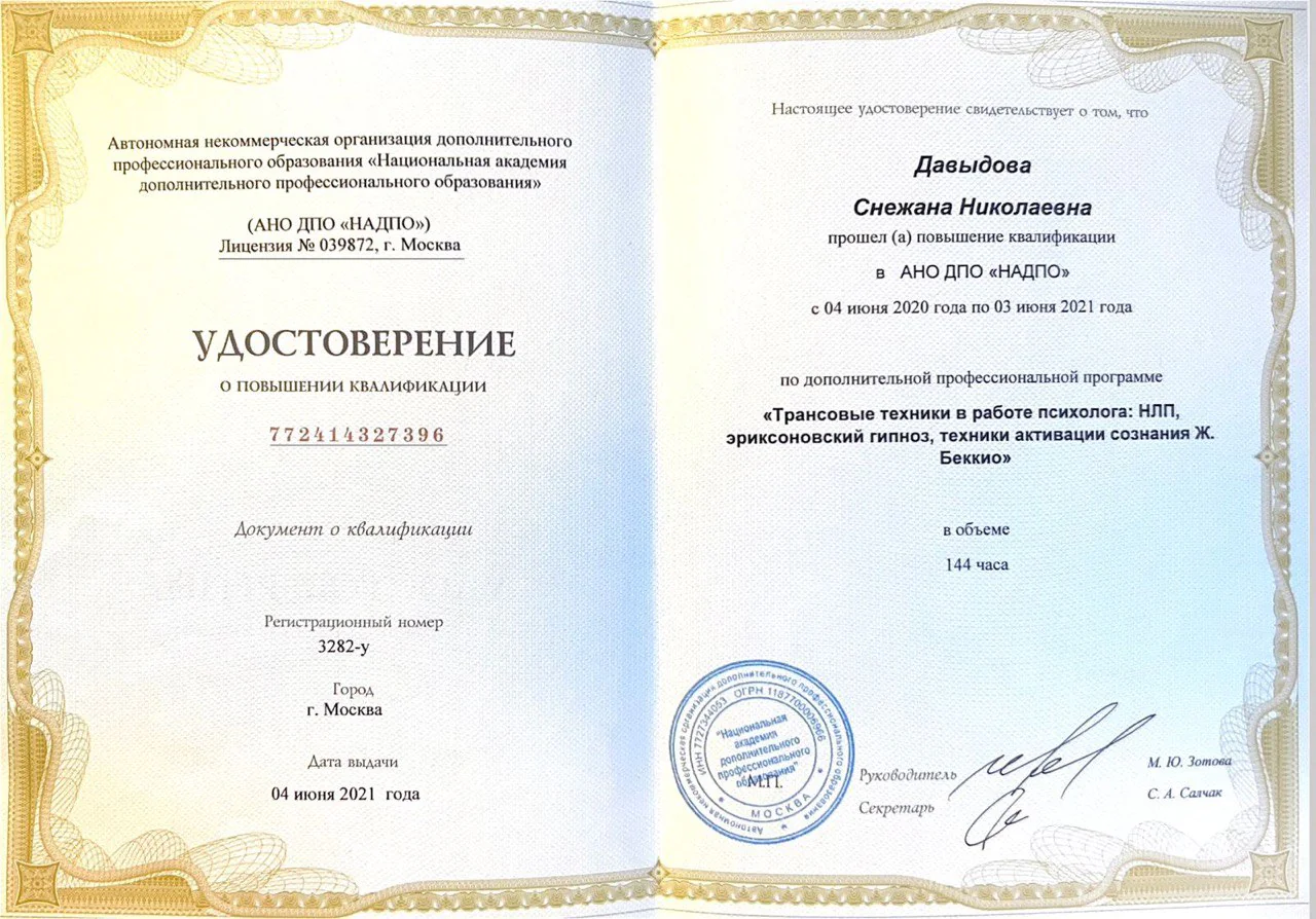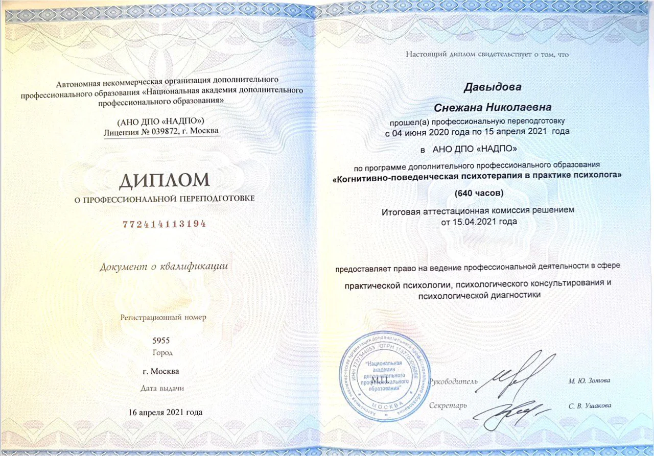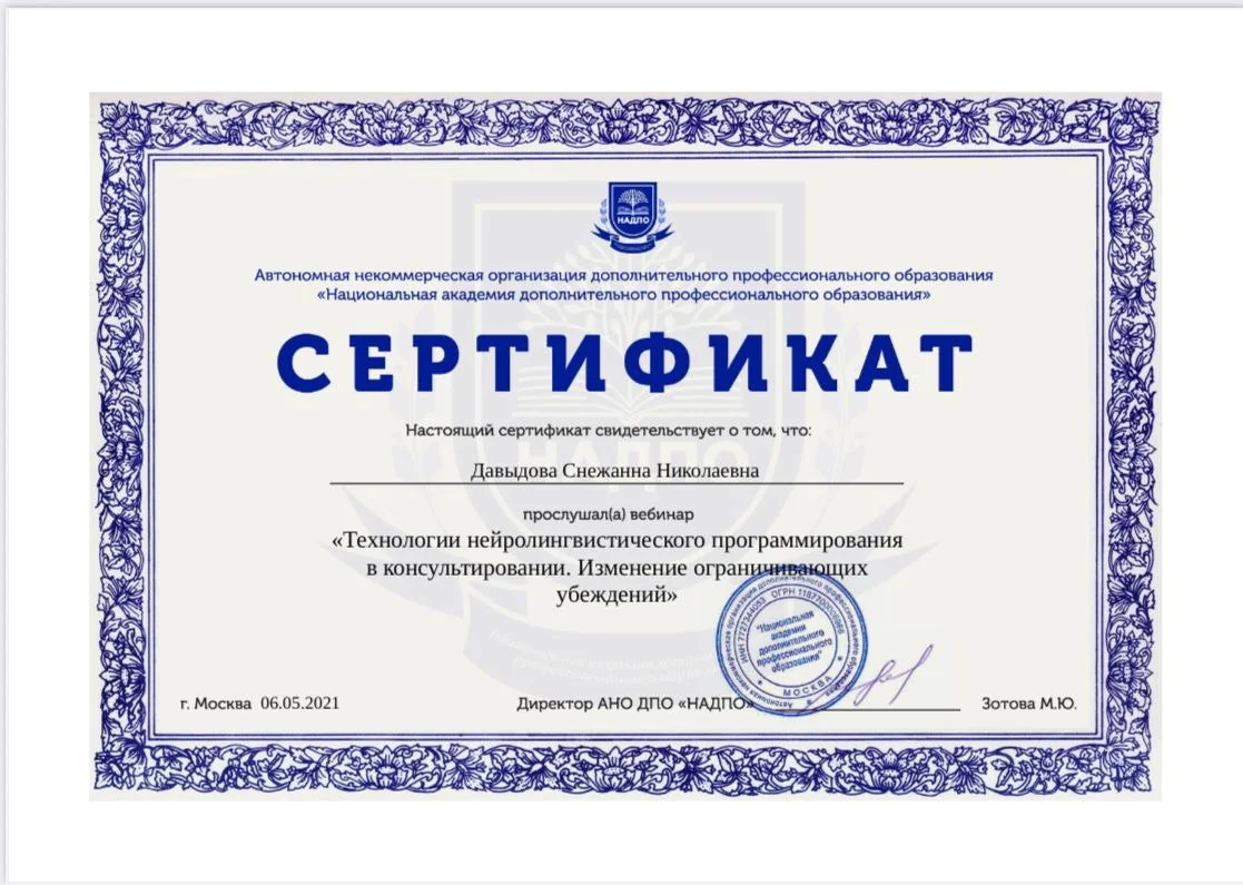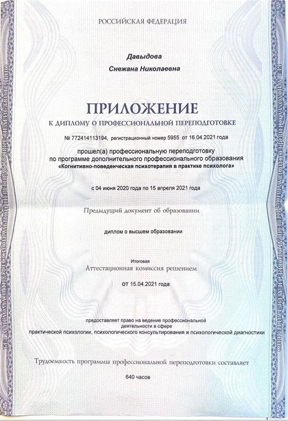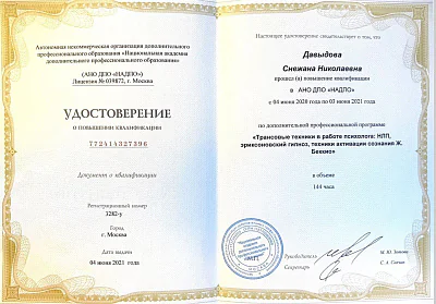 Профессиональная переподготовка «Когнитивно-поведенческая психотерапия в практике психолога» по дополнительной профессиональной программе «Трансовые техники в работе психолога: НЛП, эриксоновский гипноз, техника активации сознания Ж. Беккио»
