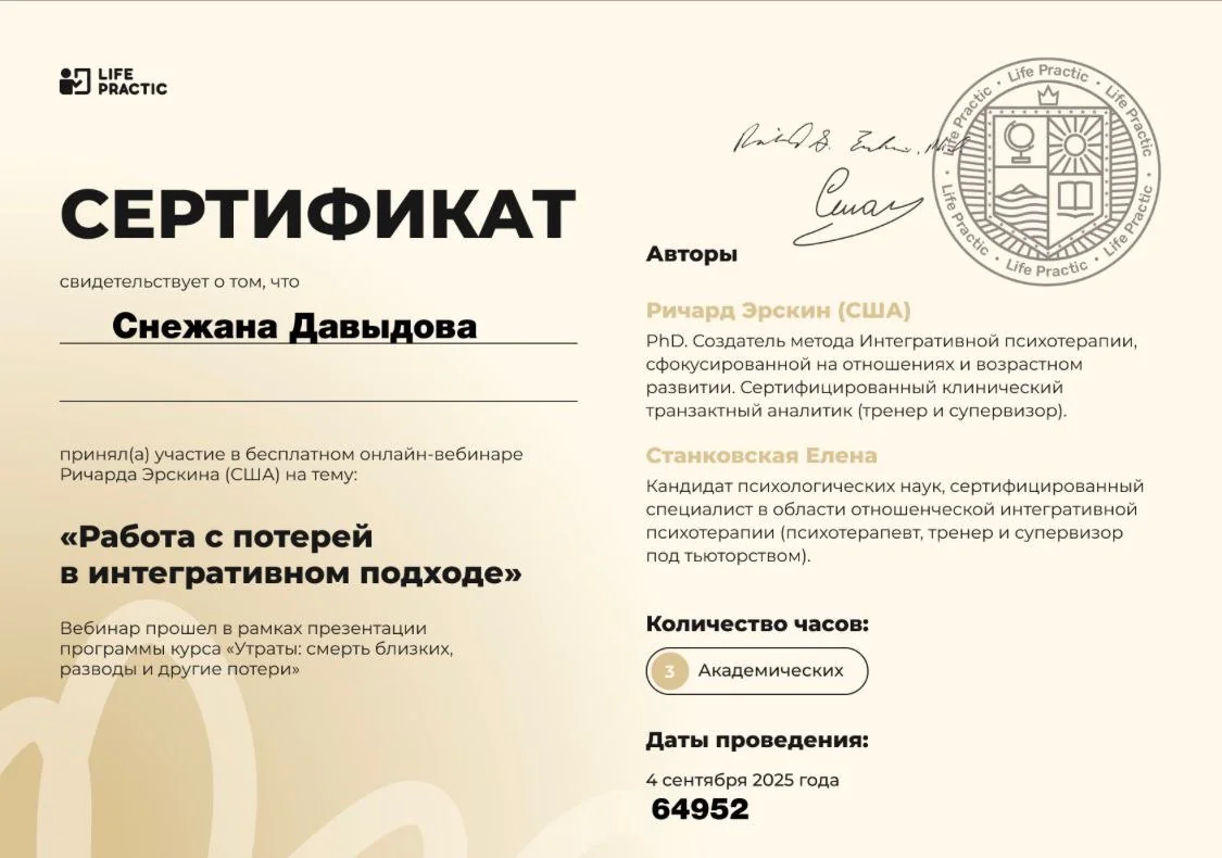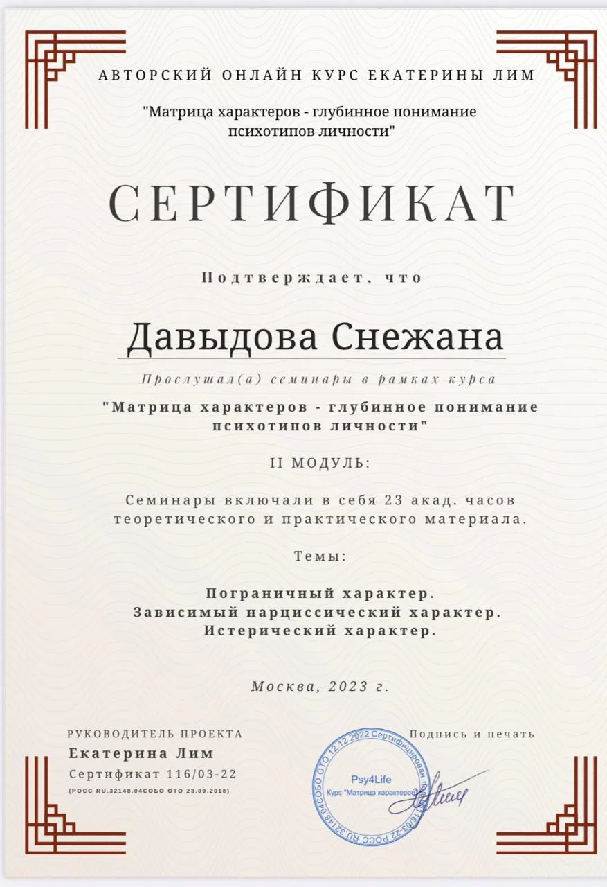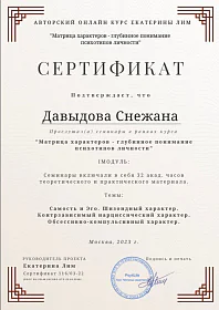 Давыдова Снежана Николаевна — практикующий психолог с опытом работы в области диагностики и лечения психологических состояний и расстройств. Занимается профессиональной помощью взрослым пациентам при эмоциональных и поведенческих трудностях.