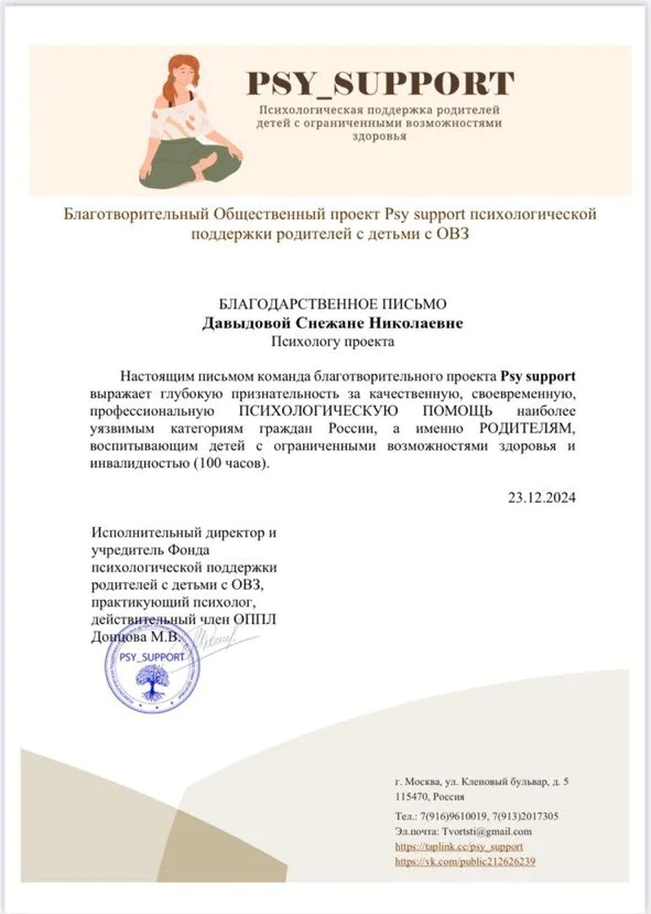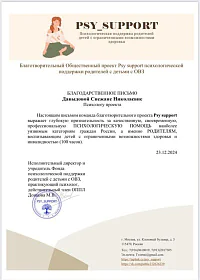 Участие в Благотворительном общественном проекте Psy support психологической поддержки родителей с детьми в ОВЗ