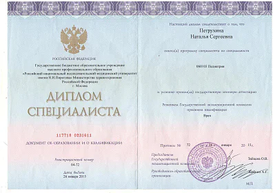 Российский национальный исследовательский медицинский университет имени Н.И. Пирогова, специализация «Педиатрия»